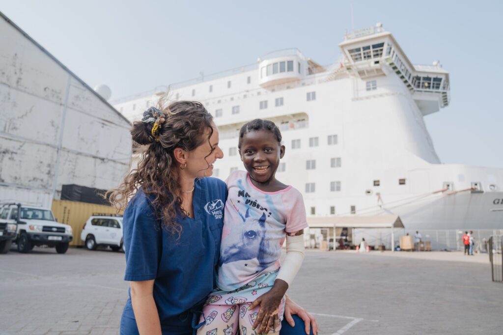 Eight-year-old Musu walked up the gangway of the Global Mercy™ with hope in her heart and a folded left arm – the result of a severe burn scar contracture that had tightened her skin and bent her little finger. Burn contractures like Musu’s are a serious complication, where scar tissue thickens and tightens over time, resulting in functional limitations.